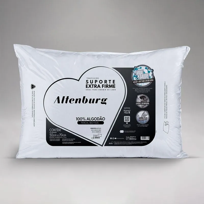 Experimente o Travesseiro Altenburg Suporte Extra Firme, ideal para quem busca um travesseiro firme sem abrir mão do conforto. Conhecido popularmente como o "travesseiro do coração" este travesseiro é especialmente indicado para quem dorme de lado, este travesseiro possui revestimento em percal 180 fios, 100% algodão, oferecendo um toque suave e aconchegante.