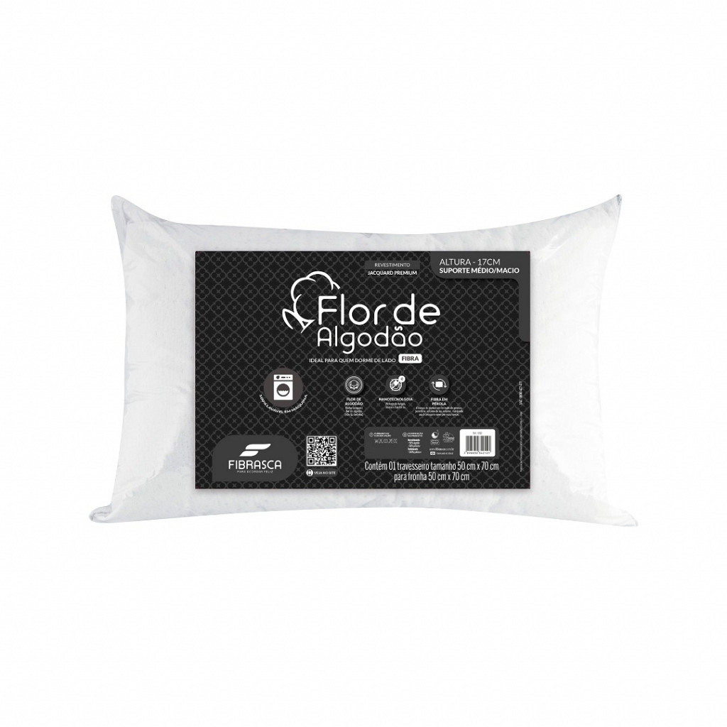 O travesseiro Flor de Algodão Fibrasca traz extremo conforto na hora do sono. O enchimento em fibra siliconada, permite que o produto seja integralmente lavado, centrifugado e secado em máquina sem rasgar ou embolar. Revitalizável, retornando ao volume original após afofamento. Seu travesseiro como novo por muito mais tempo. A capa em exclusiva malha jacquard Flor de Algodão Fibrasca, oferece um toque suave e confortável além de contar com nanotecnologia, que protege de fungos, ácaros e bactérias.