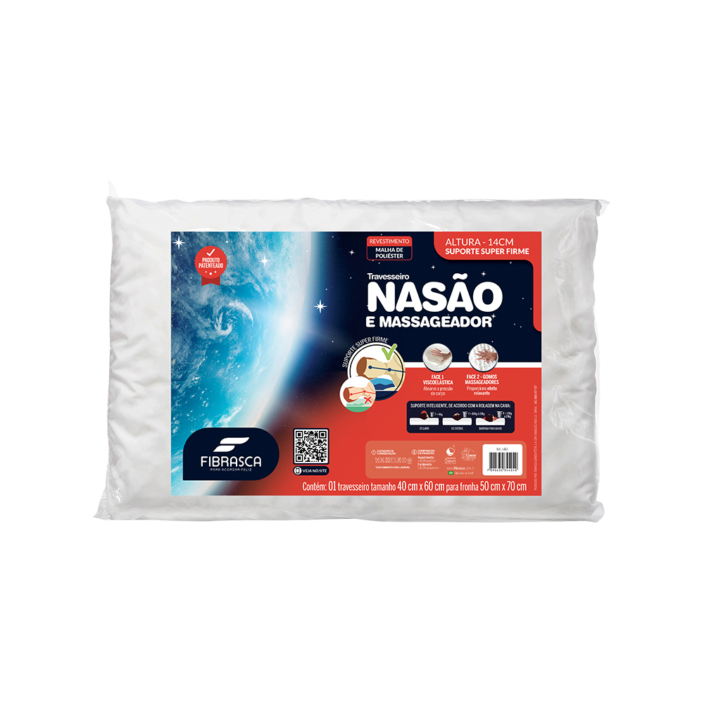 O travesseiro Nasão e massageador Fibrasca, suporte super firme, possui o conceito de dupla face e foi desenvolvido para trazer versatilidade e conforto para o sono em um único produto. Com uma face em viscoelástico (Nasa) se tem a maciez e absorção da pressão do corpo e na outra com espuma perfilada com gomos que trazem o toque massageador e confortável. A capa em malha proporciona um toque suave e macio ao produto.
